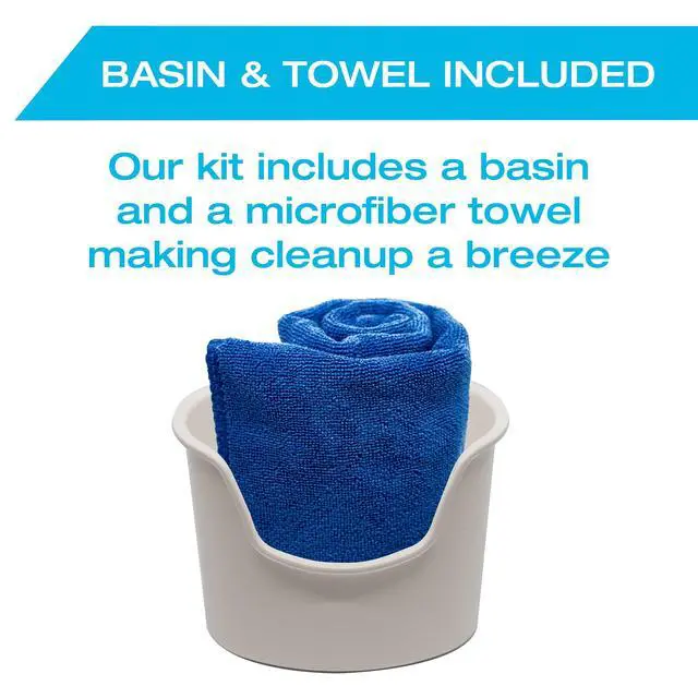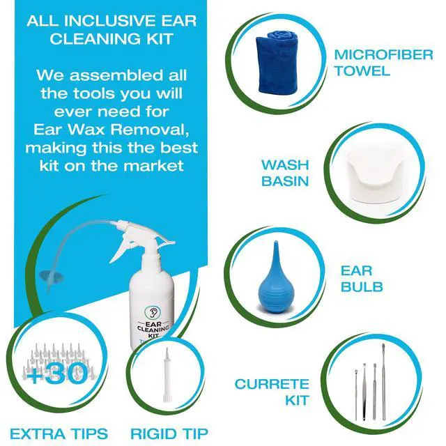 This ear washer set includes a lightweight catch basin that surrounds the lower ear and a soft microfiber towel for a mess-free experience. Between irrigation sessions, use the included four-piece stainless steel curette set and a bulb syringe.
