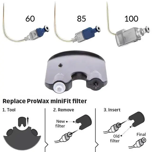 Oticon standard speaker 100, 85 and 60 Oticon ProWax minifit receiver hearing aid.