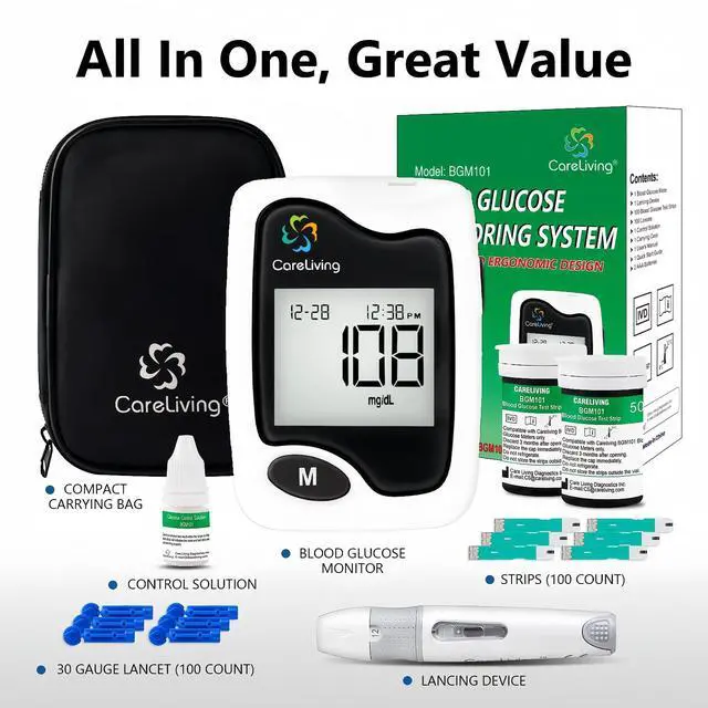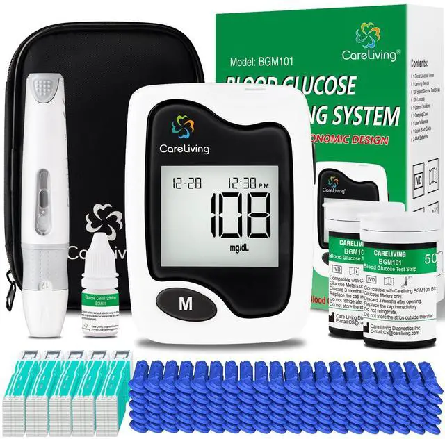The Careliving BGM101 Diabetes test kit is equipped with 1 Blood Sugar Monitor, 100 Test Strips, 100 Lancets, 1 Lancing Device, 1 Control Solution, 1 Product Instruction Manual, 1 Quick Start Guide and 1 Carrying Bag.