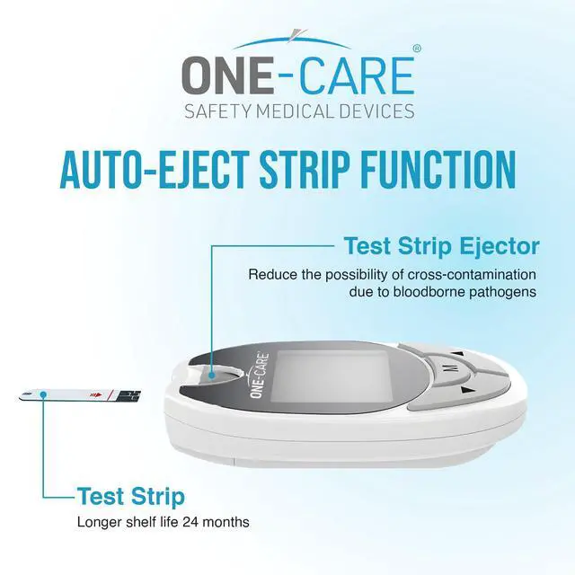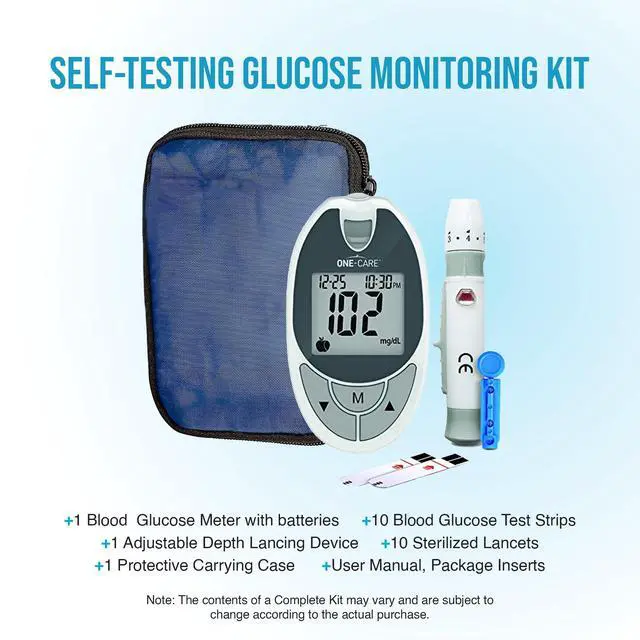 COMPLETE GLUCOSE MONITOR KIT: Includes 1 ONE-CARE Glucose Meter with large display and auto-eject strip function, 10 advanced biosensor technology test strips, 1 lancing device with multiple depth settings, 10 ultra-thin 30G lancets, 1 carry case, 1 log book, and 1 user manual. This is a complete diabetes testing kit, ready to use