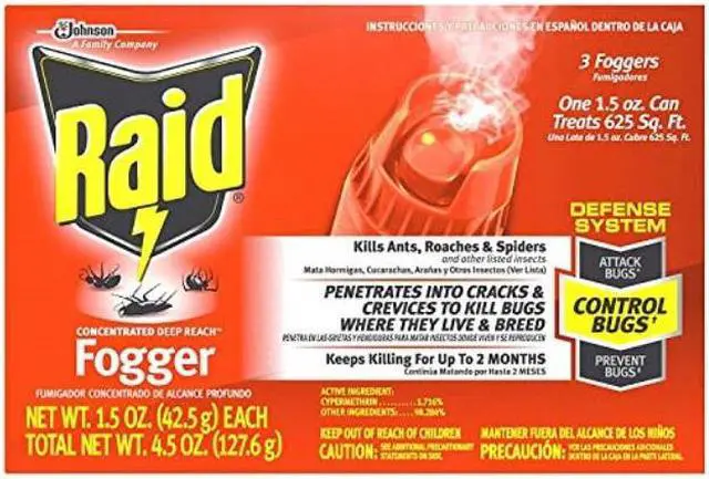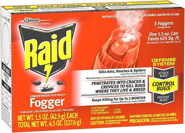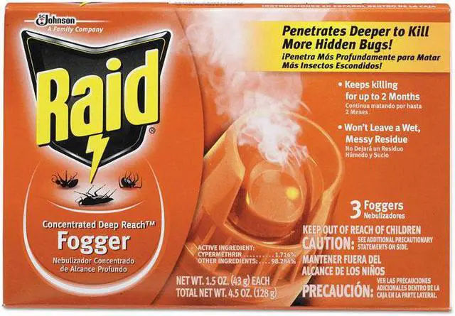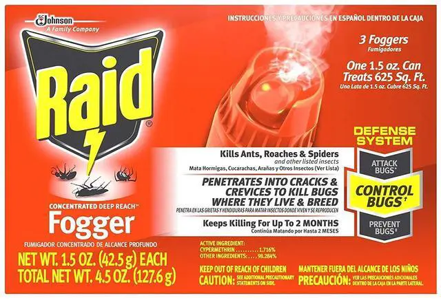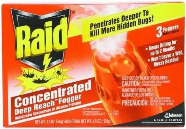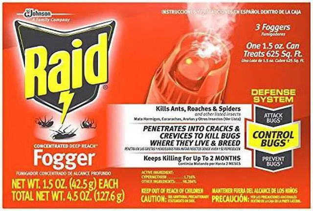 Raid Concentrated DEEP REACH Fogger allows you to automatically fill an average size room (up to 625 sq. ft.) with an insect-killing fog while you re away. It penetrates into cracks crevices and carpet fibers. It won t leave a wet messy residue and it won t stain. Use the fogger in your apartment home attic basement cabin garage storage areas shed or camper.