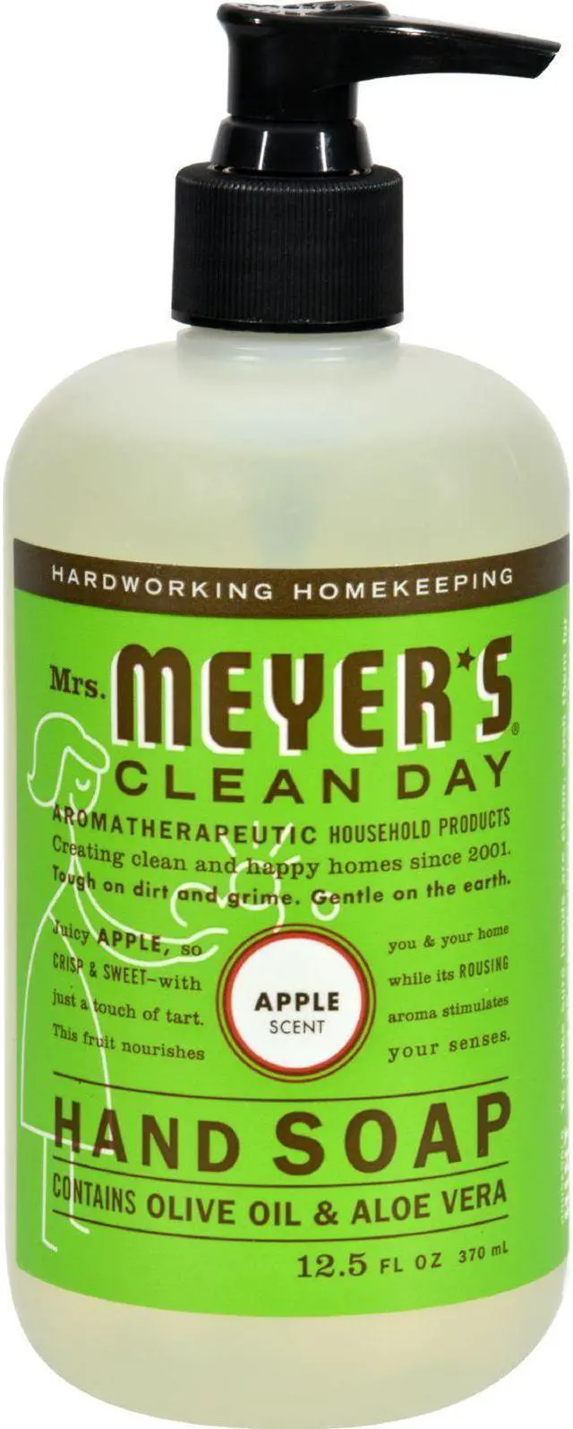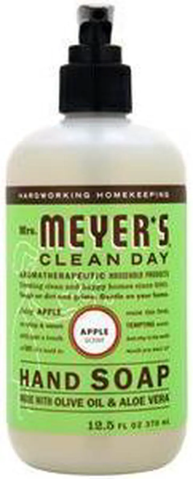 Mrs. Meyer's Liquid Hand Soap - Apple - 12.5 oz. Brand New. . Juicy APPLE, so crisp and sweet - with just a touch of tart. Mrs. Meyer?s Clean Day Apple Liquid Hand Soap contains aloe vera gel, olive oil and a unique blend of natural essential oils to create a hardworking, non-drying, yet softening cleanser for busy hands. Hands have never had it so good. Mrs. Meyer's Clean Day products are powerful on dirt and grime, yet gentle enough to use on your hands and body and paraben free. Each product is made with plant-derived ingredients and natural essential oils. Not only do these soaps smell like a garden, they are good for you, your home and the planet. Moisten your hands, then add Mrs. Meyer?s Clean Day Liquid Hand Soap. The longer you rub your hands, the cleaner they become. If you have young children, have them sing Happy Birthday twice and their little hands will be clean as a whistle before they know it. So easy! The formula is made from 98% naturally derived ingredients like fruit oil and olive oil.. .