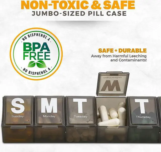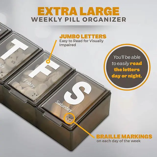 There is nothing worse than not knowing what pills you still have to take or missing a dose. Our MEDca extra large pill organizer has Extra-large compartments which means that you can fit about 20 assorted pills in one compartment. With our 1 pack Weekly Pill Organizer, you can Sort pills by the time of day, a full weeks at a time or share with a loved one.