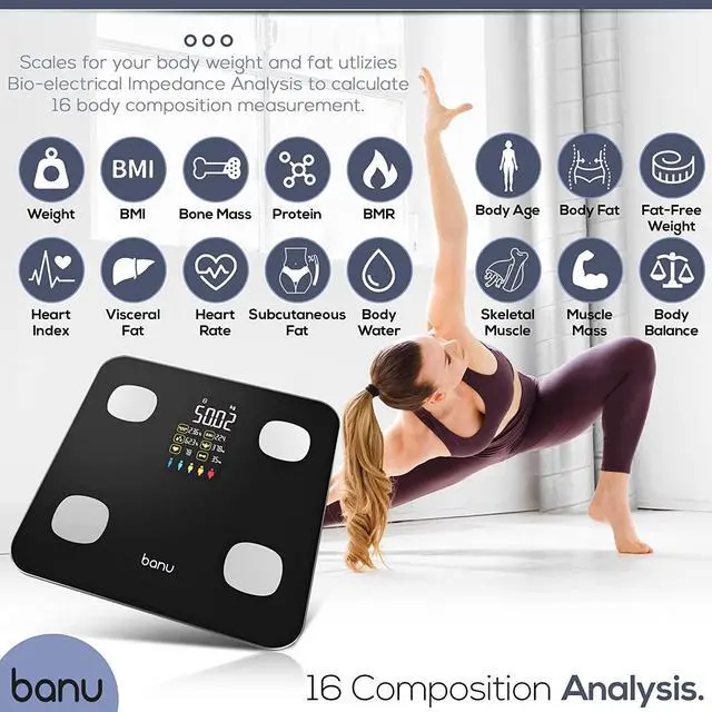 - 16 Essential Body Composition Analyzer: Scales for your body weight and fat utilizes Bio-electrical Impedance Analysis to calculate 16 body composition measurements.
