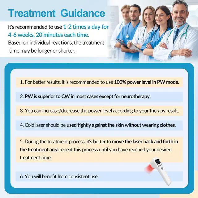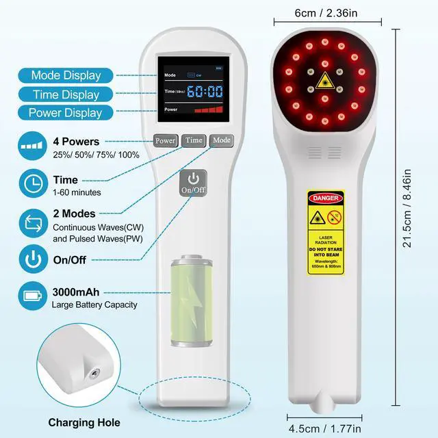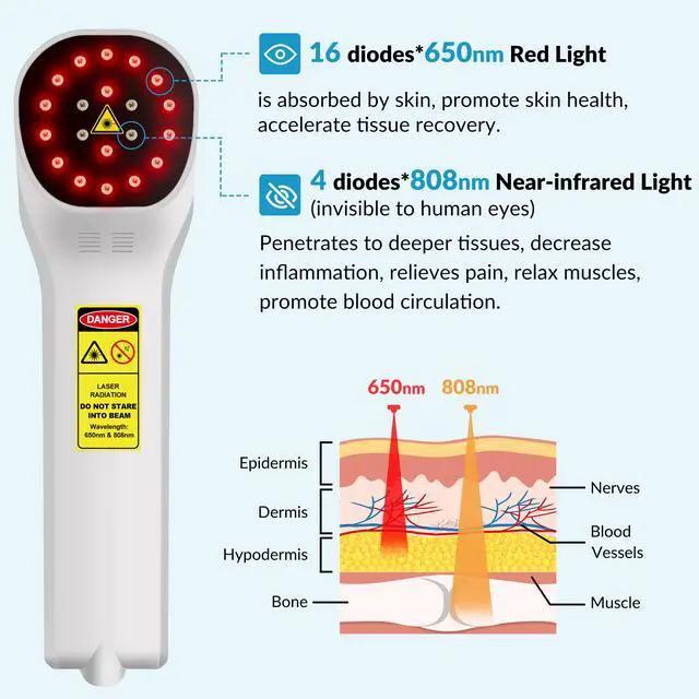 Cold Laser Therapy DevicesThe cold laser treatment device has 2 wavelengths: 650nm & 808nm . laser light therapy is a noninvasive treatment that utilizes specific wavelengths of red light(650nm) and near infrared light(808nm) to your body skin. it is also called low level laser therapy(lllt) or photobiomodulation therapy (PBMT). It's a scientifically proven therapy that provides a drug-free, safe solution, no side effects, Safe & Painless, Medical Grade, Professional, Recovery Faster, Cost-effective.