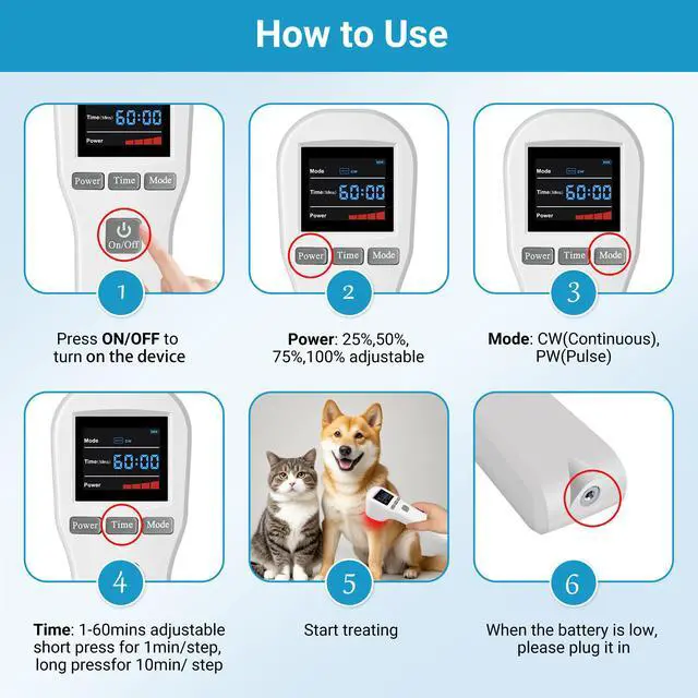 Applications of LLLT Cold Laser for Home Usecold laser device can reduce pain, inflammation, promote blood circulation, wound heal, and the light therapy can treat Arthritis, sports injuries, Back pain, frozen shoulder, acute and chronic pain, neuropathy etc. cold level laser therapy also helps regene, nerve tissue after surgery. lllt therapy can also be used for a wide range of pet conditions including gingivitis, intervertebral disc problems, post-operative pain, soft tissue trauma, open wounds and more. Suitable for humans and pets(dogs, horse, cats etc.)