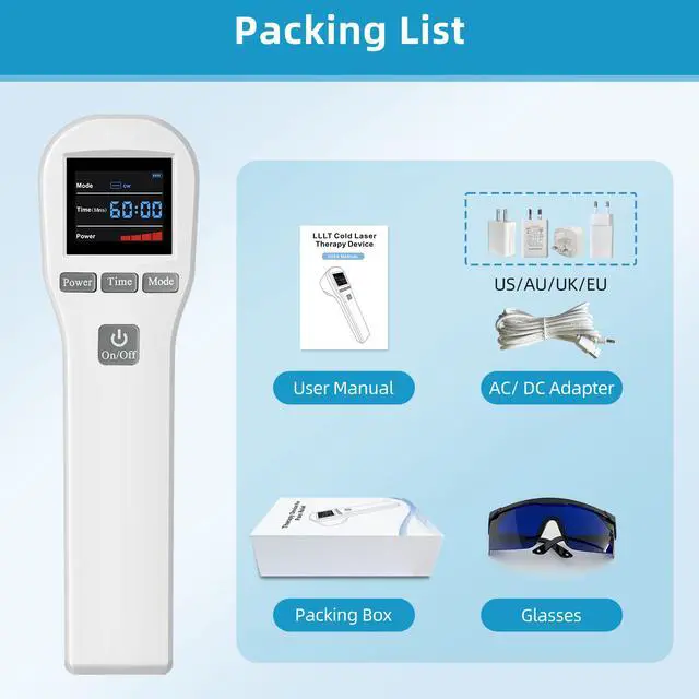 Package Details of Low Level Therapy This red light phototherapy includes 1 * lllt laser therapy device+ 1 * AC Adapter with Charge Cable + 1 * Eye Protection Glasses + 1 * User Manual + 1 * product box. More detail information, please see the product manual.If you have any questions about the red laser therapy device, please contact us. We are committed to providing you with satisfactory services.