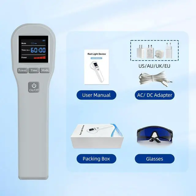 Package Details of Low Level Therapy This red light phototherapy includes 1 * lllt laser therapy device+ 1 * AC Adapter with Charge Cable + 1 * Eye Protection Glasses + 1 * User Manual + 1 * product box. More detail information, please see the product manual.If you have any questions about the red laser therapy device, please contact us. We are committed to providing you with satisfactory services.