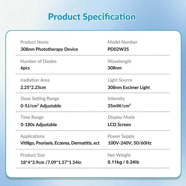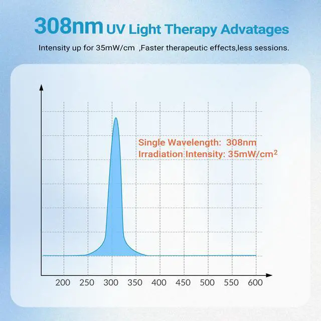 308nm UVB Phototherapy Light308 excimer ultraviolet light therapy is narrow-spectrum ultraviolet B band phototherapy device with a peak wavelength of 308nm. Blue light therapy can direct high-energy uv rays to the treatment site, that`s targeted therapy, protecting normal skin. Non-invasive treatment of various skin diseases without side effects. Such as vitiligo, psoriasis etc. Suppresses overactive immune system, activate pseudo-catalase, boosts vitamin D levels.