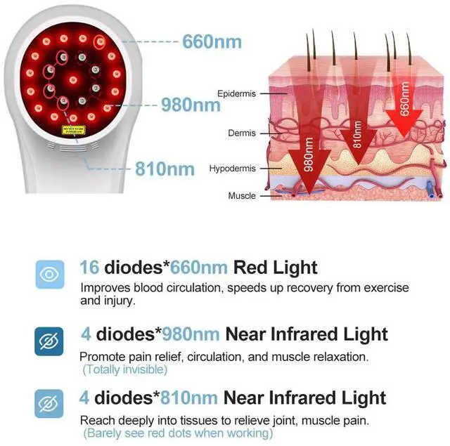 [Mls 660nm, 810nm, 980nm of Handheld Cold Laser lllt Machine] 660nm red light therapy works on the upper surface of the skin. it can improve blood circulation, reduce inflammation, and improve wounds healing. 810nm infrared light therapy is invisible to the human eye, it can penetrate deep in the tissue layer to relieve pain from deep muscle and joint like knee arthritis. 980nm near infrared red light lasers can stimulate the dermal collagen growth, enhancethe skin’s elasticity and resistance.