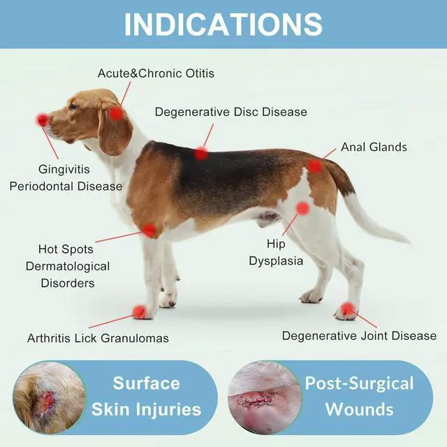 Pain Relief, Open Wounds, Injuries, Acute & Chronic Otitis, Degenerative Disc Disease, Hip Dysplasia, Degenerative Joint Disease, Hot Spots Dermatological Disorders, Arthritis Lick Granulomas, Anal Glands, Musculoskeletal Abnormalities, Paw Pads Swelling Up, Gingivitis Periodontal Disease, Inflammation, Ear Infections, Soft Tissue Injuries, Trauma, Nerve Regeneration