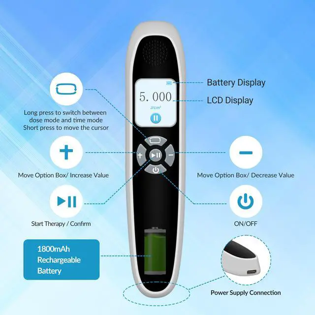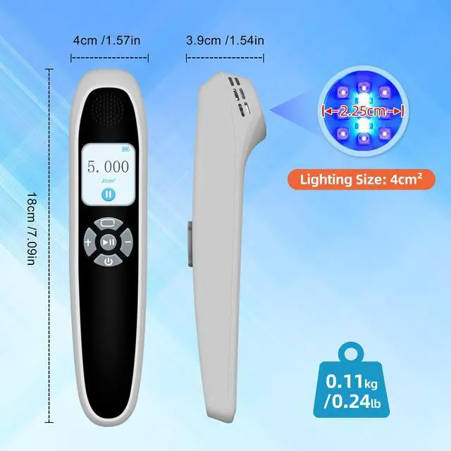 [Multifunction Mode]light therapy medical devices is 4cm2 irradiation area. PDT blue light therapy lrradiation Intensity 55mW/cm2; dose setting range 0-5J/cm2, adjustable; Time range is 0-180 seconds, adjustable. The treatment time of each irradiation is generally 1-3 minutes, and the treatment frequency is 3-4 times a week. typically seeing results within 4 to 8 weeks. Device weight: 0.24 lbs easy to carry.