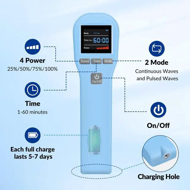 [Multi-functions of the Infra Red Light Therapy Device]Power: 220/440/660/880mW four levels adjustable(Class 4/3b); Time: 1 to 60 minutes adjustable; Mode: CW-continuous wave and PW-pulsed wave at 10Hz adjustable ( There is evidence proven that PW is superior to CW for most application except nerve regeneration ). (Note: Long press On/Off of low laser therapy to turn on/off device, quick click On/Off of low level cold laser to work). cold laser for pain is recommended to use 1-2 times a day for 4-6 weeks, 20 minutes each time(according to your physical condition)