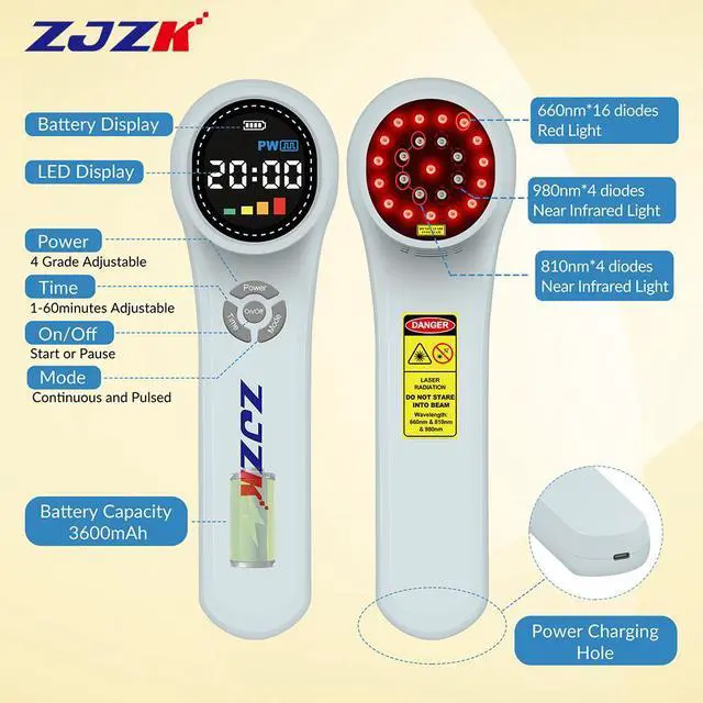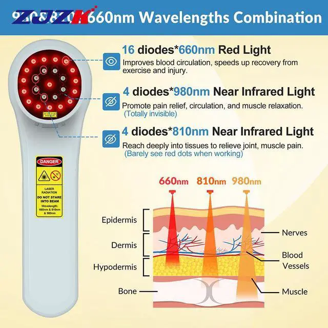 660nm Red Laser Light can improve blood circulation, 810nm Near-infrared Laser Light relieve pain from deep muscle and joint, and 980nm Near-infrared Laser Light can stimulate the dermal collagen growth while vasculartreatment, increase epidermal thickness and density.1760mW laser healing therapy devices, 24 diodes in total, 16diodes*660nm*10mW, 4diodes*810nm*200mW and 4diodes*980nm*200mW, painless and sterile treatment, let you say goodbye to pain and protect your health.