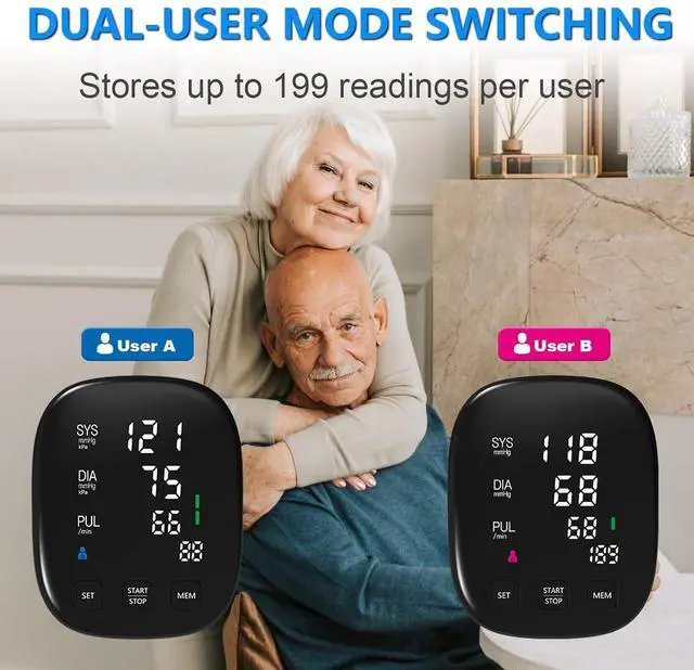 Convenient and Versatile Designed for convenience, our BP monitor provides quick readings in just 40 seconds and quickly interprets blood pressure status with a color-coded display. There is also a dual-user memory function that allows each user to store up to 199 sets of readings, eliminating the hassle of manual recording.