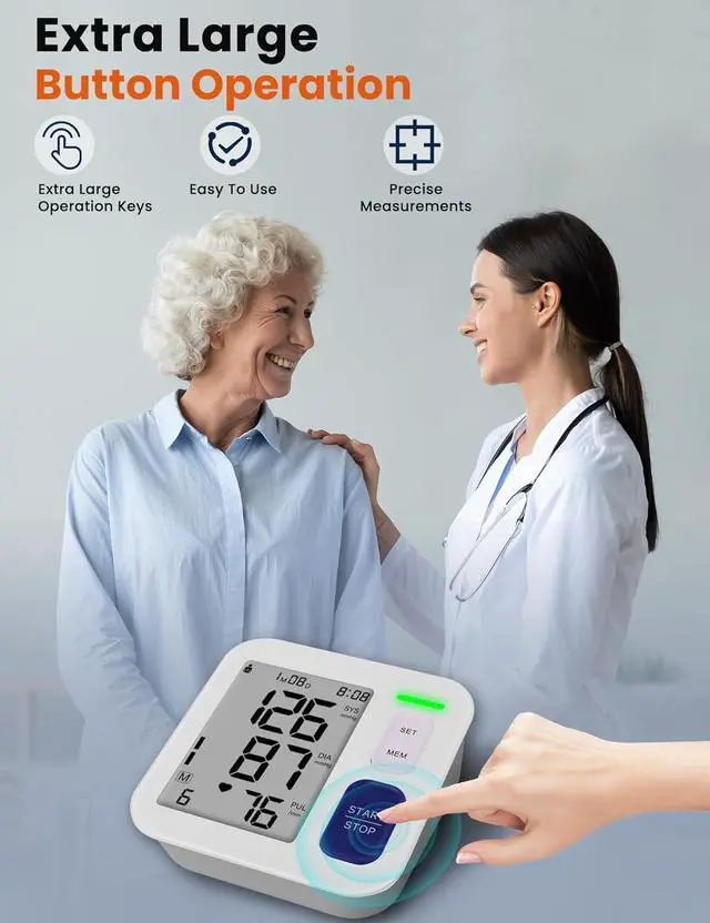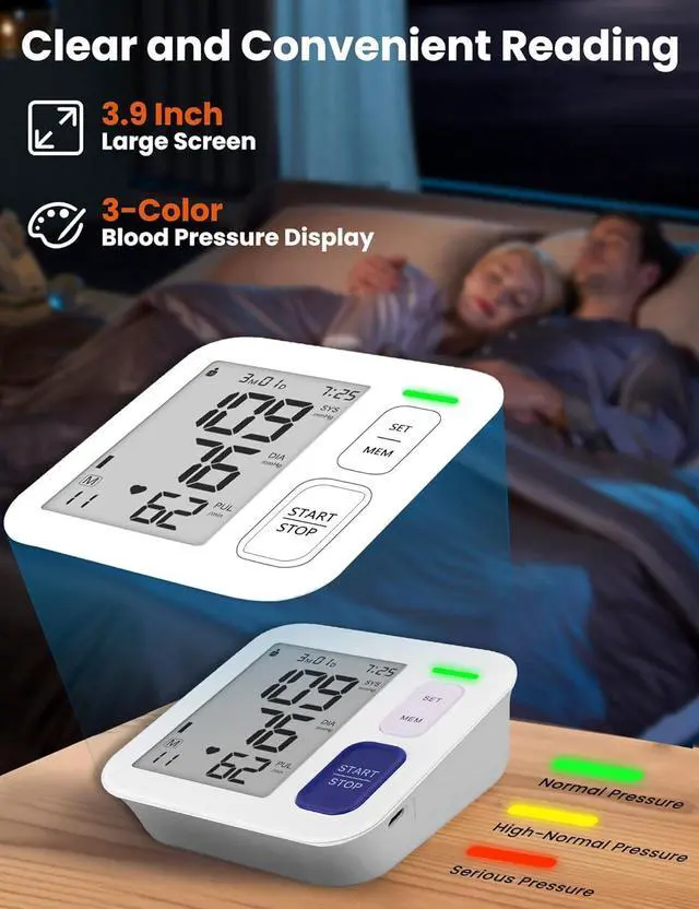 LCD Screen Display - The 4inch/10cm LCD screen display makes reading easier and clearer. Through the three color indicator light, clearly display the blood pressure results at the level.