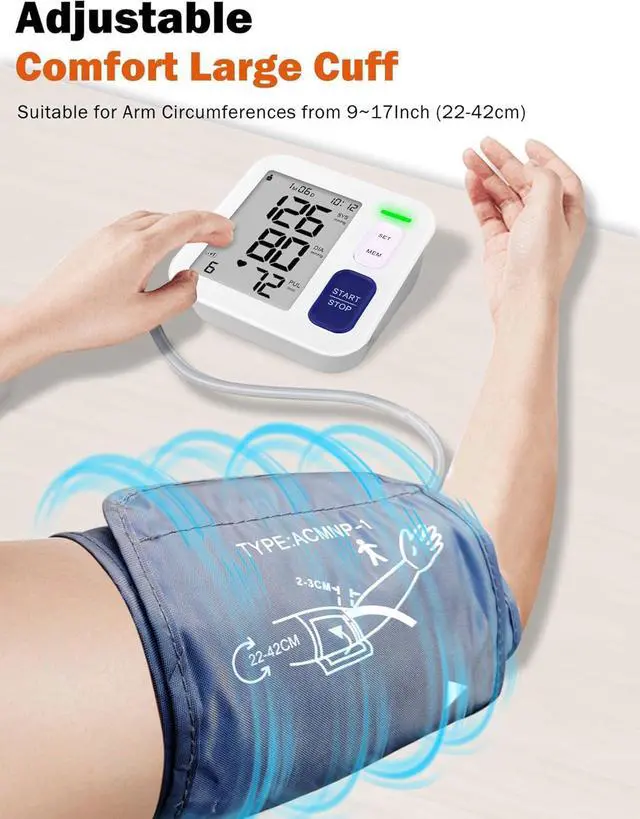 Large Cuff and Measurement - Suitable for arms with arm circumference 9-17inch(22-42CM), suitable for use by people with different arm sizes. Measurement accuracy of (pressure) 3 mmHg and (pulse) 5%. The measurement range of (pressure) 0 to 299 mmHg and (pulse) 40 to 199 pulses/min gives users accurate and reliable measurement results.