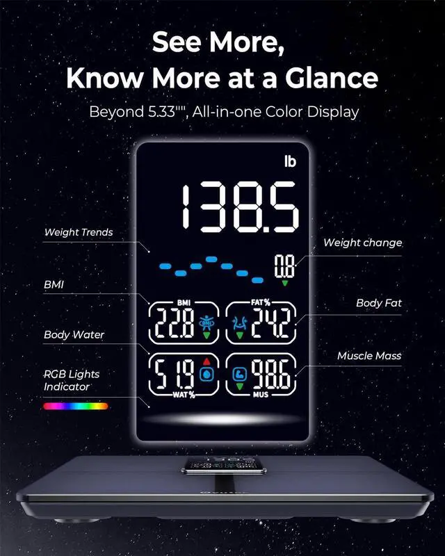 Exclusive Display & Custom Light: The extra-large 5.3" screen not only displays key metrics (BMI, body fat%, water%, muscle%) but also tracks weekly body weight trends. Plus, enjoy an exclusive customizable breathing light in any color you like