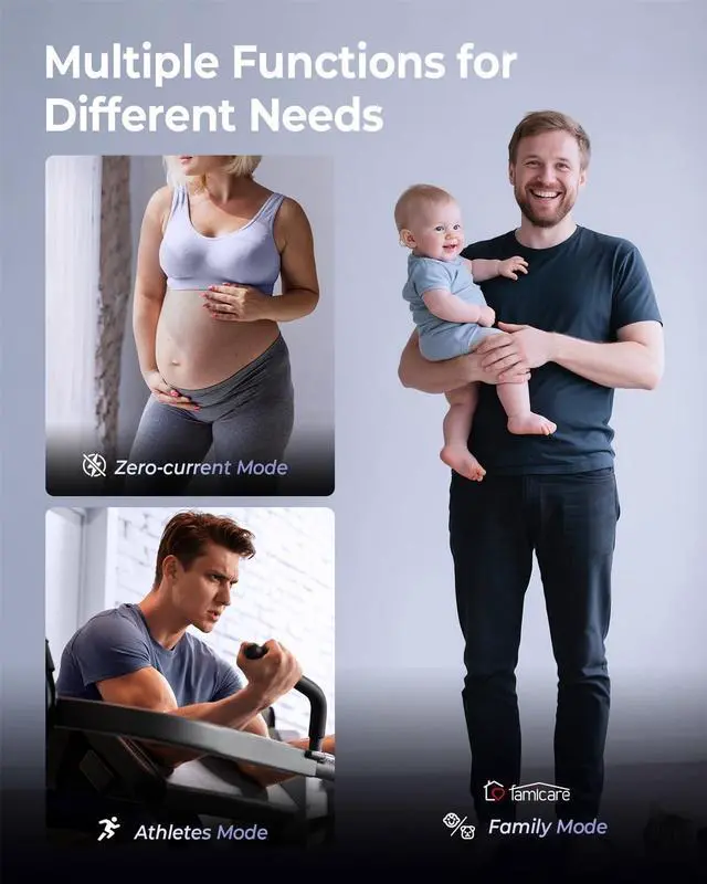 Friendly Features: 1) Unlimited Users makes it convenient for the whole family; 2) Zero-Current Mode ensures a safe weighing option for expectant mothers; 3) Family Mode tracks the growth of babies or pets; 4) Athlete Mode povides more accurate and suitable data for athletes