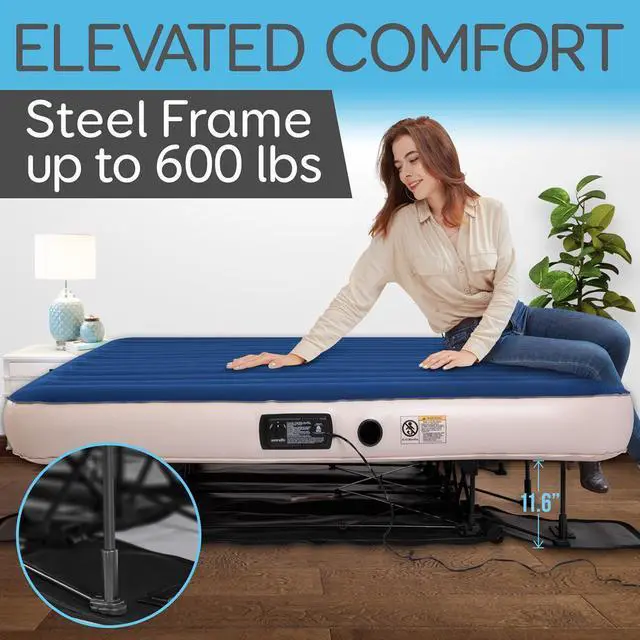 The SereneLife SLEZBDKG50 Premium Raised King Airbed is the perfect solution for a comfortable nights sleep, whether youre hosting guests or on the go. Featuring a built-in high-output AC pump, this airbed inflates and deflates in under 3 minutes for quick setup. The raised 20-inch height mimics the feel of a traditional bed, providing a more comfortable and natural sleep position. The airbed includes a sturdy PVC mattress with enhanced coil technology and a plush flocked-top surface that helps keep bedding in place. It is supported by a powder-coated steel frame for long-lasting durability, and the mattress is capable of supporting up to 600 lbs.