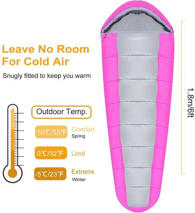 *DESIGNED FOR 3 SEASONS:Our sleeping bags are designed for near-freezing temperatures and have a temperature range from 23-50- meaning its comfortable temperature is at 50,great to use for 3 seasons(Spring,Autumn,Winter). Moreover,these bags also have moisture-proof,weather-resistant design to keep you warm and prevent you from any dampness.