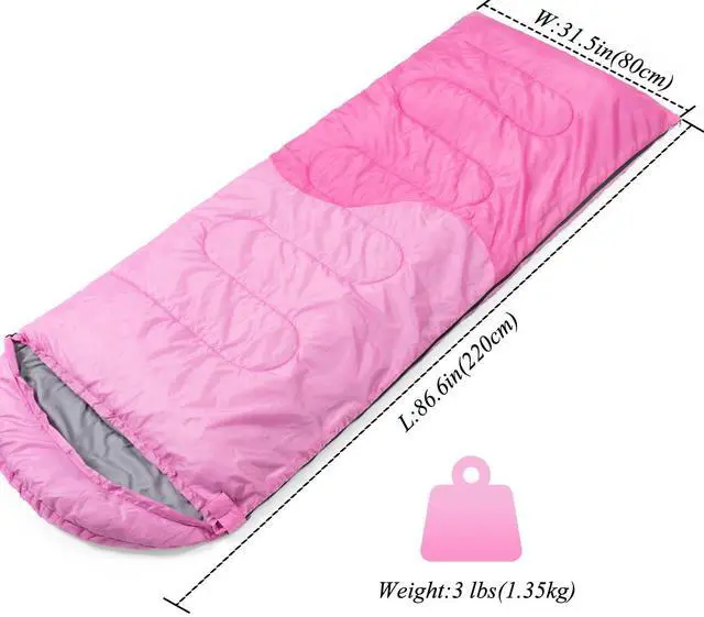 Roomy and Lightweight:The size of the sleeping bag is 86.6 x 31.5 inches220 x 80 cm).Pack weight is about 3.3lbs.It could be fully opened to be a blanket for picnic or play.Convenient to carry along for any outdoor adventures with the carry bag