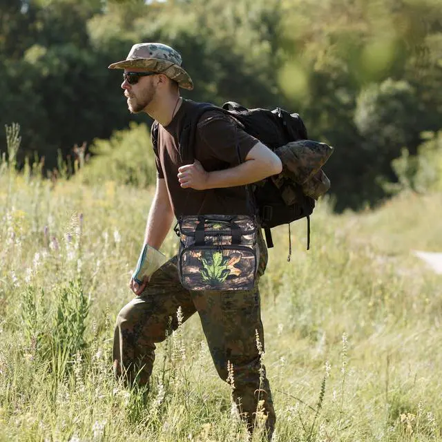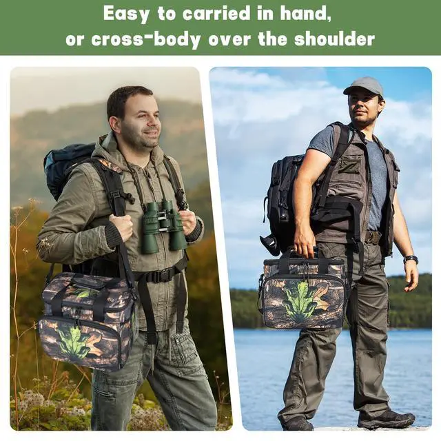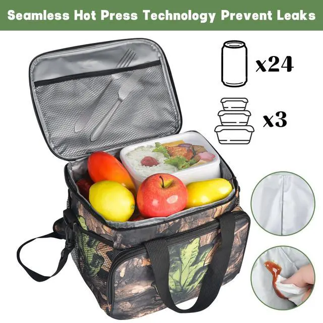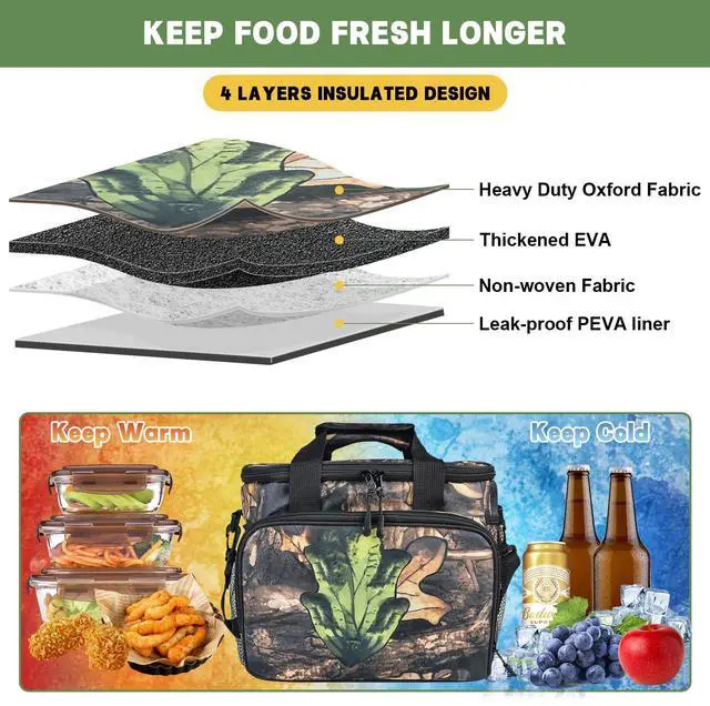 Premium Materials: The camo lunch bag is made from strong and durable Oxford fabric, and the lining is insulated with PEVA liner material and heat-pressed seamless stitching to ensure leak-proof and keeps food fresh. The shoulder straps and carry handles are double-stitched for an upgraded load-bearing capacity, so it can withstand the rigors of tactical or work settings