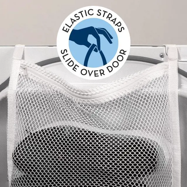 Place washed shoes into the dryer bag and close the zipper. Secure the bag to the dryer door using the elastic straps and dry shoes using the appropriate cycle for the shoe type. The mesh drying bag fits most dryer doors.