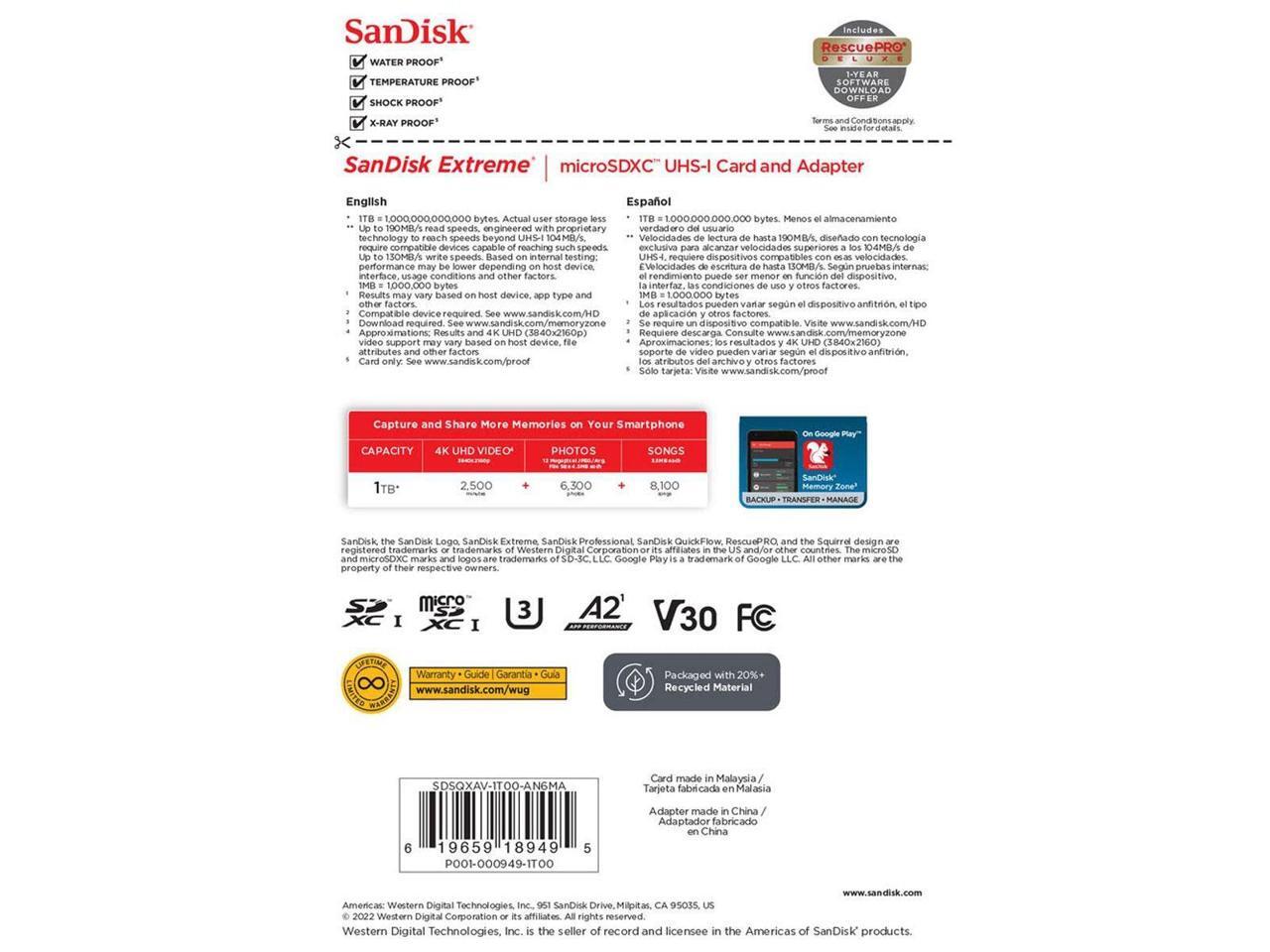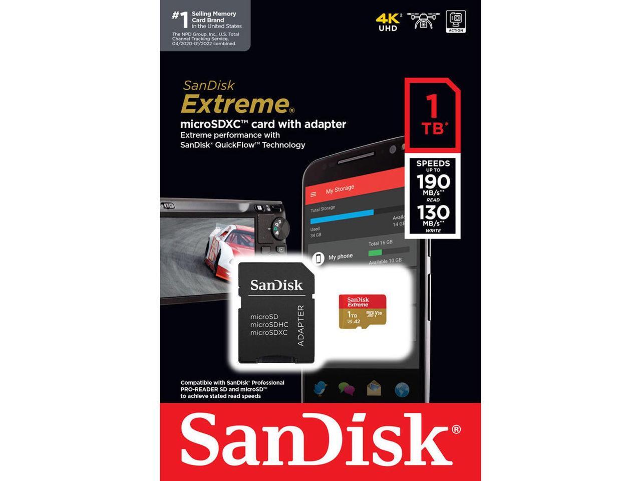 - SanDisk Extreme 1 TB Class 3/UHS-I (U3) V30 microSDXC - 190 MB/s Read - 130 MB/s Write - 10 Year Warranty - Lifetime Warranty