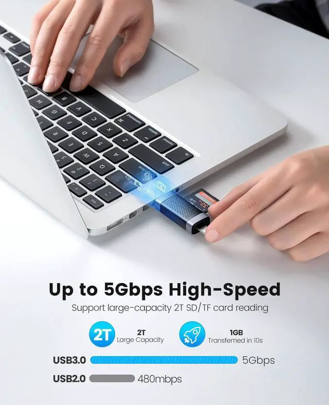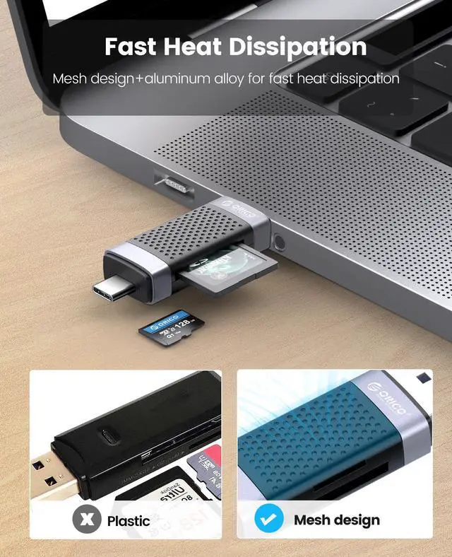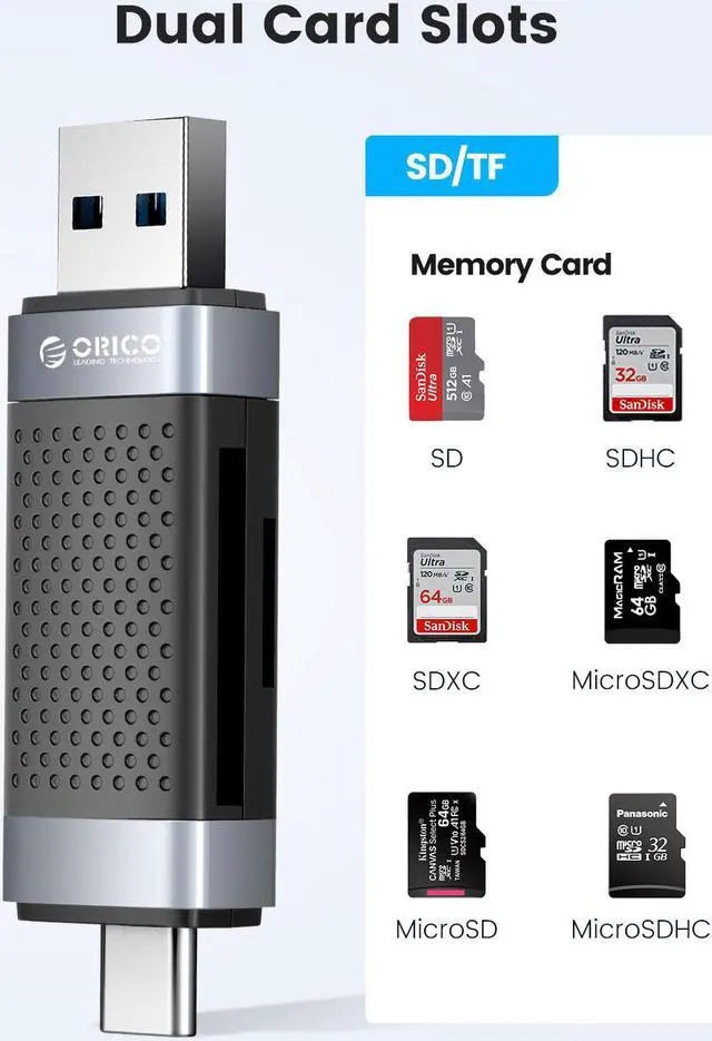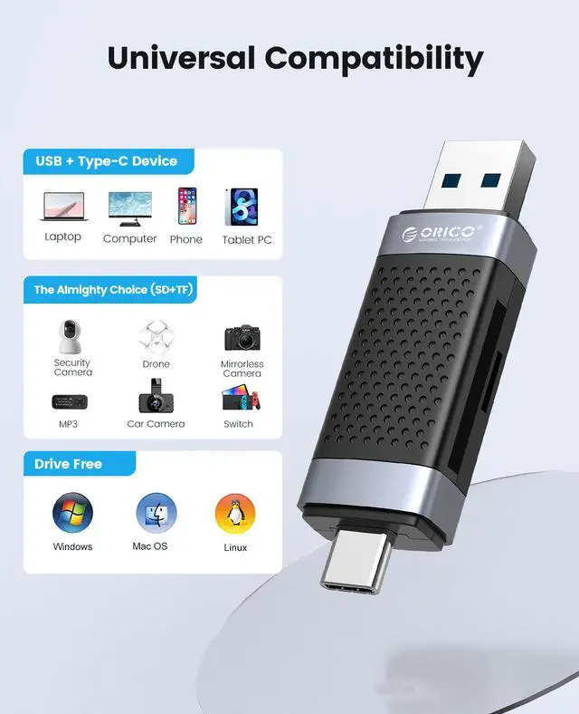 ORICO CD2D series is a card reader that reads memory cards with USB-A+USB-C dual interfaces; it can be widely used in various device memory cards to meet the needs of card readers. The maximum USB 3.0 5Gbps transmission rate can be supported, and the transmission is stable, which can meet most outdoor play, camping, outdoor operations, business office data transmission, plug and play.