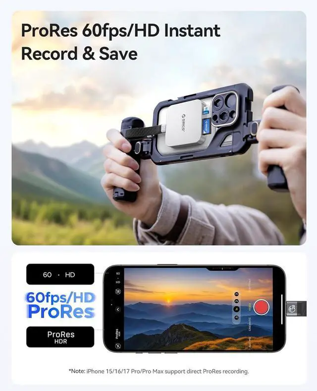 Direct ProRes Video Saving:ProRes videos shot with iPhone 17/16/15 Pro/Pro Max can be instantly saved to SD/TF cards via this iphone sd card reader. Note: Due to SD/TF card slot speed limits, select 1080P resolution when recording ProRes videos externally with the usb c sd card reader.