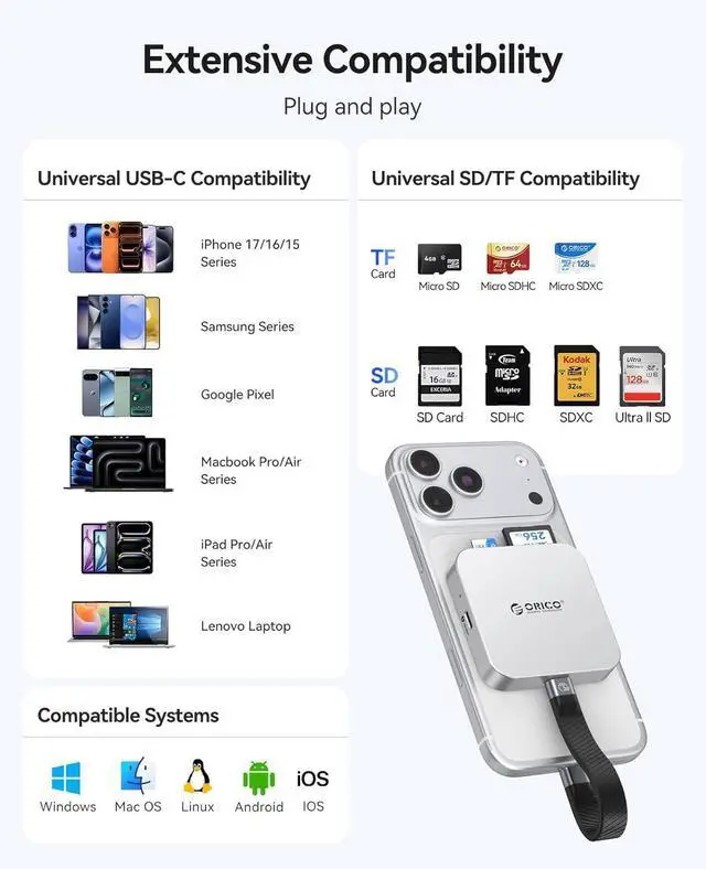 Wide Compatibility:This sd card reader is fully compatible with iPhones, MacBooks, iPad Pros, Android devices and all Type-C devices, supporting mainstream systems including Windows, Mac OS, Linux, Android and iOS. It also works seamlessly with memory cards from outdoor cameras, drones, dashcams, digital cameras, covering diverse usage scenarios.