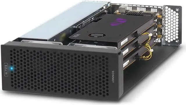 Enhance your Thunderbolt 3-compatible desktop computer with the Echo III Thunderbolt 3 to PCIe Card Rackmount Expansion System from Sonnet. This external rackmount enclosure includes one PCIe 3.0 x16 and two x8 slots, supporting full-height and full-length non-GPU expansions such as network adapters, SSD cards, USB port cards, and more. Configurations include either one double width and one single width card or three single width cards, supported by a 400W internal power supply. An internal 6-pin power connector is available, providing up to 75W of supplemental power to compatible expansion cards.