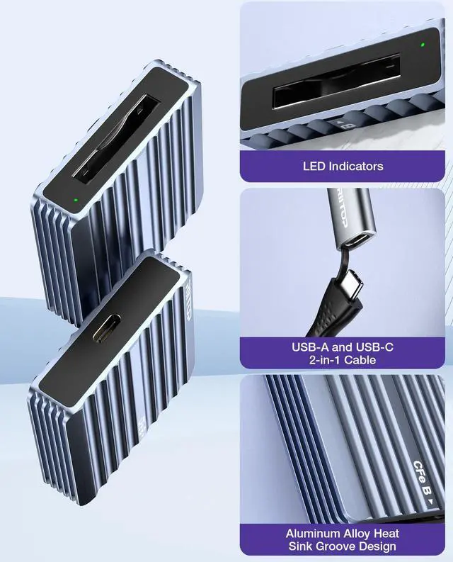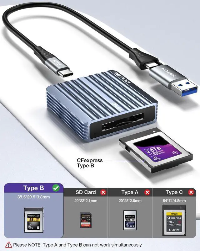 10Gbps CFEXPRESS Type B Card Reader - RIITOP CFexpress memory card (Type B) Card Reader supports USB3.2 Gen2 (10Gbps) super speed data transfer for your CFexpress card.In order to reach 10Gbps high speed,the USB/USB C port of your devices must reach the speed of USB 3.2 GEN2. Note:The final data speed is decided by the card and USB slot Type