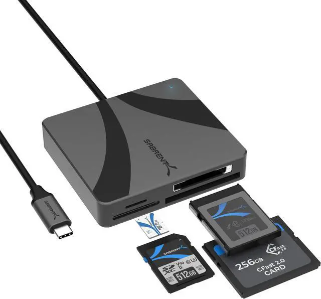 The Sabrent USB-C Multi-Card Reader (CR-C4PM) lets you transfer and swap all of your important memory cards with ease. Its portable, rugged, stylish, and plug and play - its ready to go, without drivers, with its travel-friendly, integrated USB-C cable. The aluminum main body adorns ABS casing for improved heat dissipation to keep the unit and your cards cool during sustained operation. The Multi-Card Reader includes four memory card slots of differing types with a simple status LED to let you know its connected and ready to go. Then, its just a matter of transferring your videos, photos, and other content-rich files to the system of your choice to help usher along your next masterpiece with maximum efficiency.