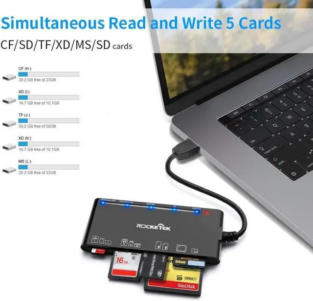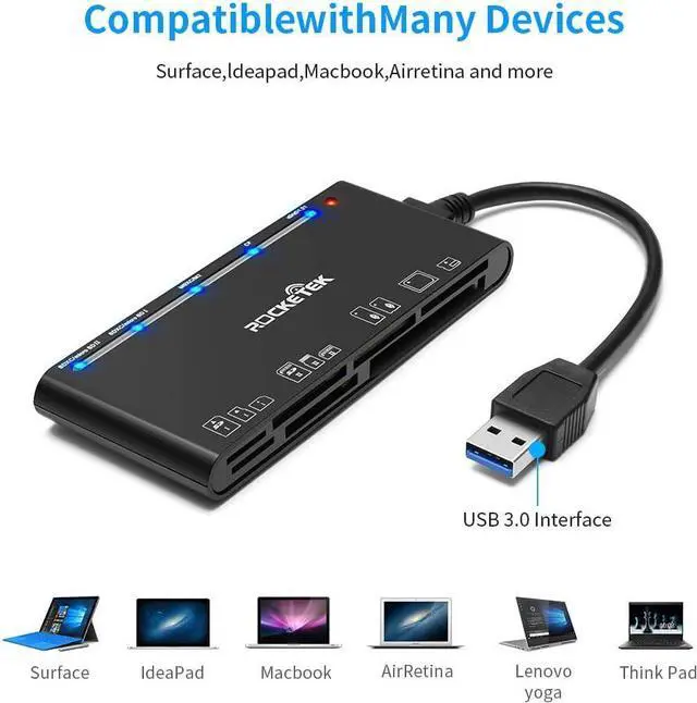 Rocketek 7-in-1 Memory Card Reader USB3.0 Super Speed Card Reader lets you easily add a multi-slot USB 3.0 Reader / Writer card to your USB 3.0 system enabled.