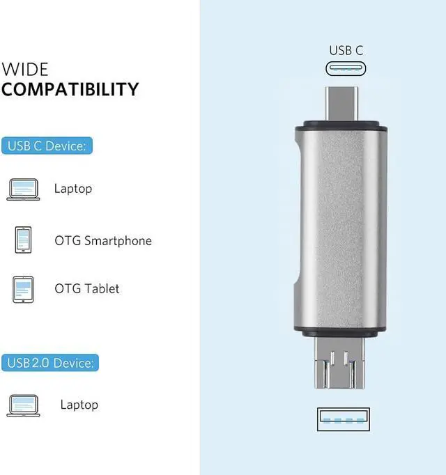 3. 3 in 1 multiple universal card reader, it includes USB 3.0 (USB-A) Port + Micro USB Port + Type-C Port