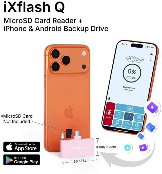 Storage that fits your lifeand your style. The PioData iXflash Q Phone Drive Card Reader in Pink makes it easy to expand phone storage while keeping everything looking cute, clean, and effortless. Simply insert a MicroSD card (sold separately) and connect to your iPhone, iPad, Android device, or computer for instant extra space.