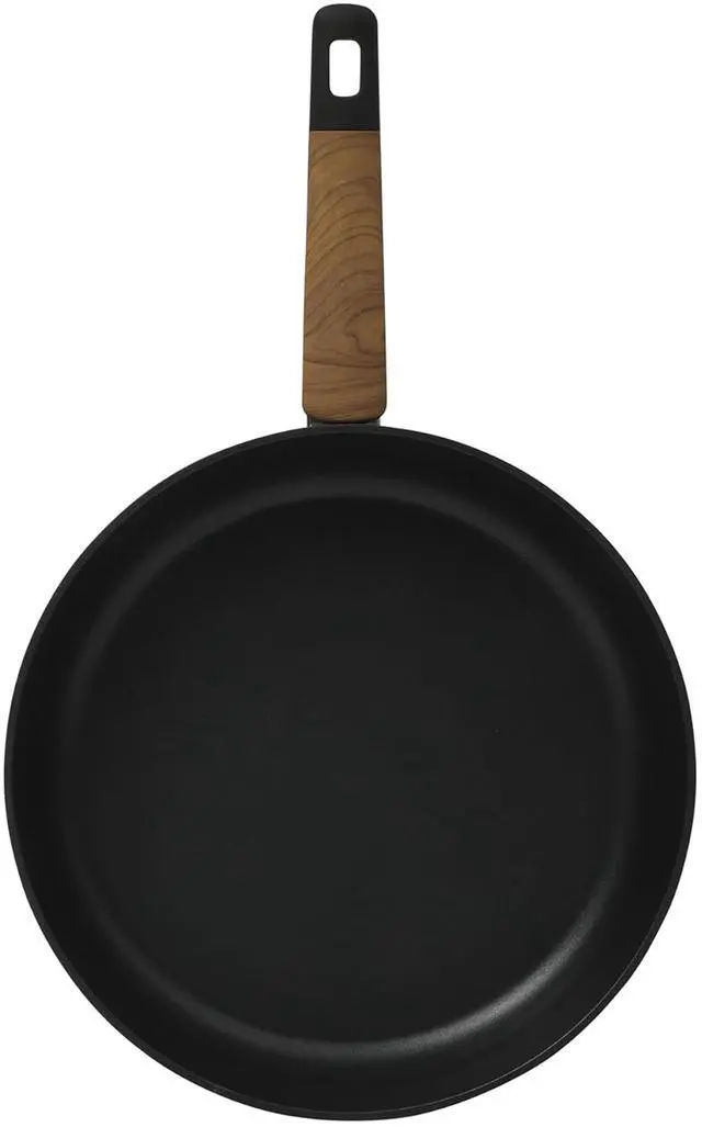 The Oster Oxburg 12 Inch Nonstick Aluminum Frying Pan in Black is a versatile cooking companion. Made from durable aluminum, it ensures excellent heat conductivity for consistent cooking results. The pan features a sleek black finish and a wood print accented handle with a soft grip, providing both style and comfort.