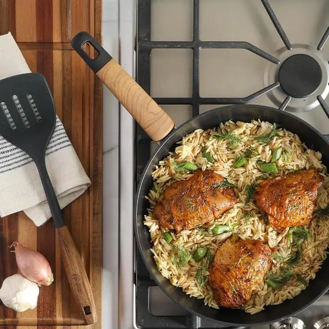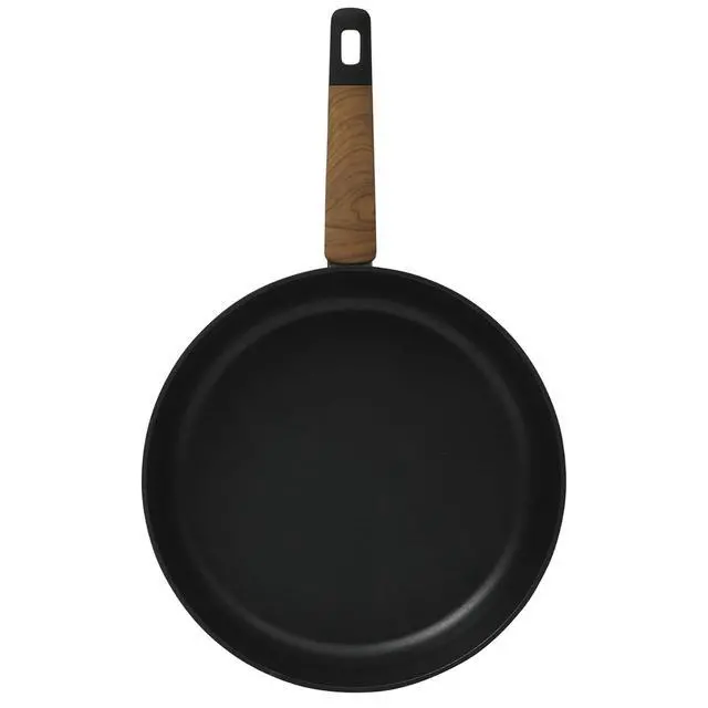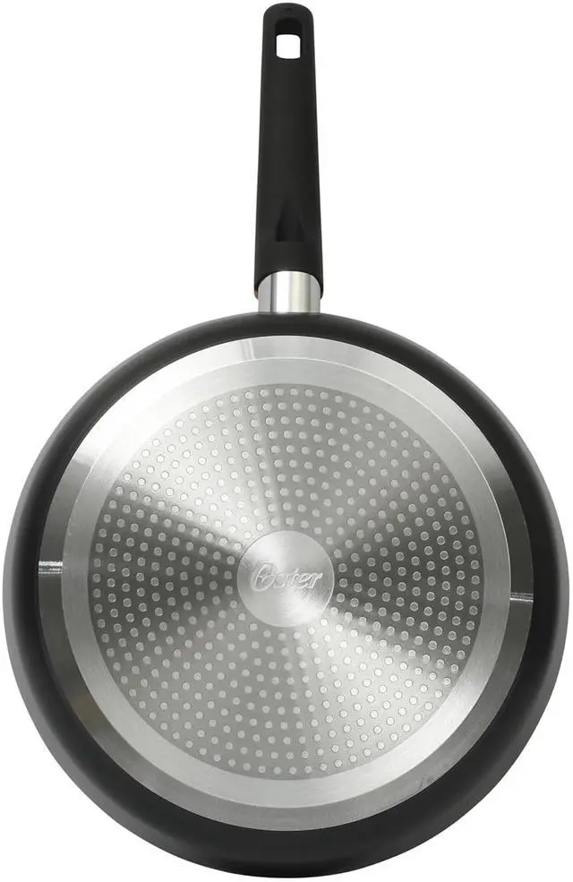 The Oster Oxburg 10 Inch Nonstick Aluminum Frying Pan in Black is a versatile cooking companion. Made from durable aluminum, it ensures excellent heat conductivity for consistent cooking results. The pan features a sleek black finish and a wood print accented handle with a soft grip, providing both style and comfort.