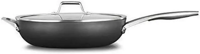 Enjoy the cooking versatility of the Calphalon Premier hard anodized Nonstick 13 inch deep skillet with cover. Its generous size makes it great for whole family meals or entertaining. The deep skillet delivers a longer lasting, superior nonstick performance for effortless food release. The durable, hard anodized exterior is dishwasher safe for easy cleanup, while the 3 layer nonstick interior is tough enough to withstand metal spatulas, spoons, and whisks. Calphalon Premier nonstick cookware is oven safe to 450°F, so it can go from the stovetop to the oven for heating and cooking versatility.