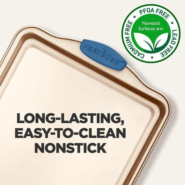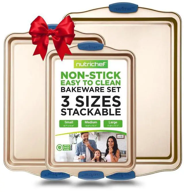 The NutriChef NCSBSG63 3-Piece Cookie Pan Set is the perfect addition to any bakers kitchen, combining elegance, durability, and convenience. Featuring a luxurious gold non-stick silicone coating, this set ensures effortless food release and hassle-free cleanup.