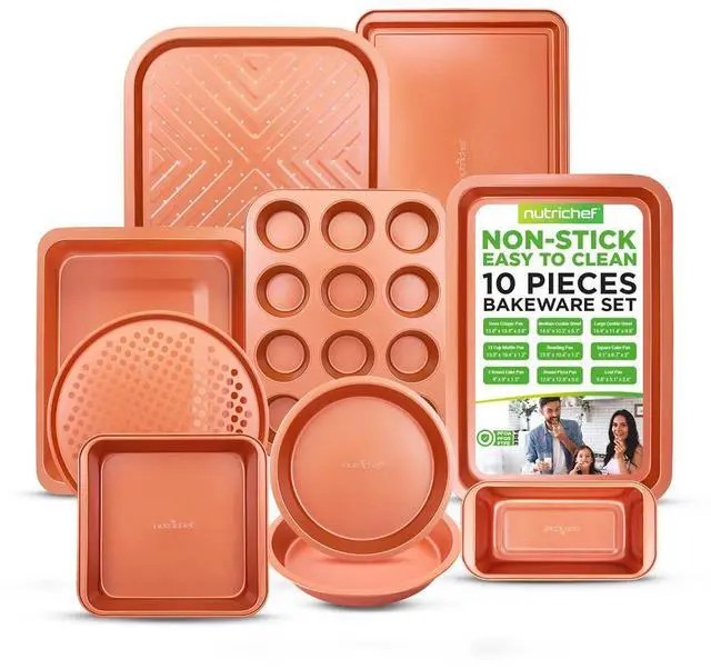 The NutriChef NCBSCC54 10-Piece Bakeware Set is designed for home bakers and professionals, featuring a durable carbon steel build with a non-stick metallic coating for easy food release and quick cleanup. Whether baking cookies, cakes, muffins, or bread, this set offers versatile baking solutions.