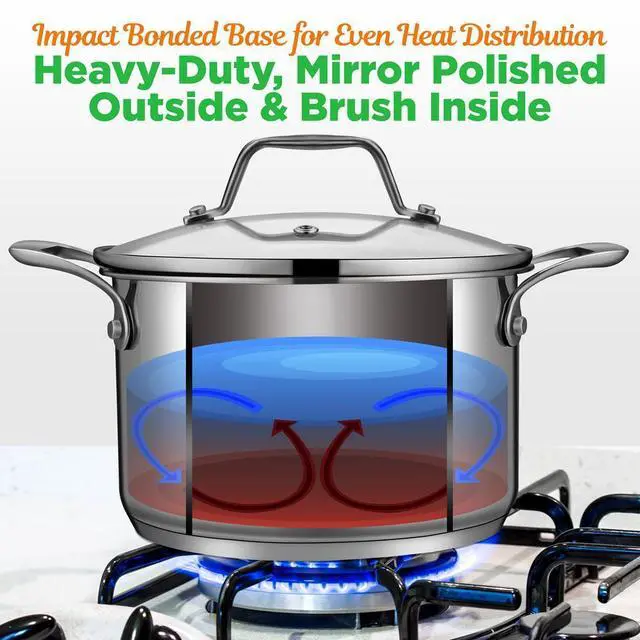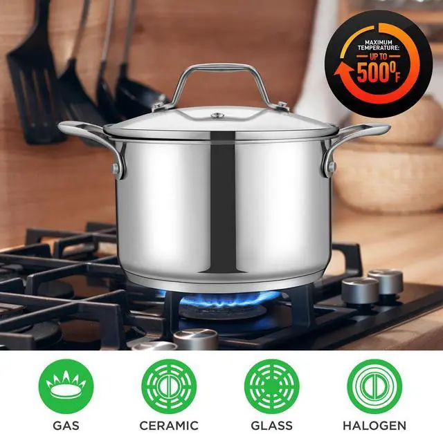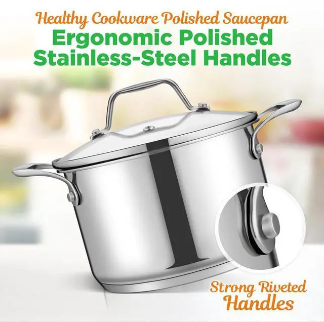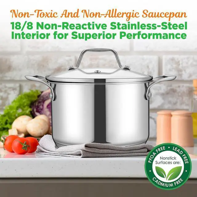 The NutriChef NCSP3 Stainless Steel Cookware Soup Pot is the perfect addition to any kitchen, offering 3-quart capacity for large soup batches or stews. Constructed with 18/8 non-reactive stainless steel, this pot provides superior performance and durability. The ergonomic polished stainless-steel handles make it easy to lift and pour, while the see-through tempered glass lid allows you to monitor cooking without lifting the lid. The impact bonded base ensures even heat distribution, making it perfect for all cooktops including gas, induction, ceramic, and glass. The heavy-duty design and mirror polished exterior give this pot both style and durability for everyday use.