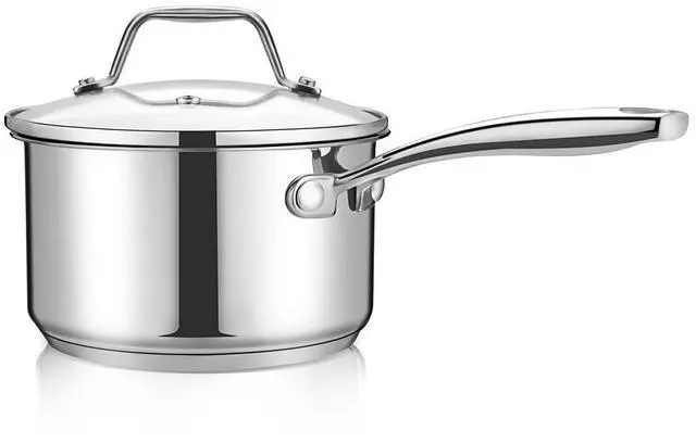 The NutriChef NCSP2 Stainless Steel Cookware Saucepan is perfect for small-batch cooking, featuring a 2-quart capacity ideal for sauces, soups, and reheating meals. Its ergonomic polished stainless-steel handle ensures a comfortable and secure grip, while the stainless steel lid helps lock in heat and flavor. Compatible with all major cooktops, including gas, induction, ceramic, glass, and halogen, this saucepan features an impact bonded base for even heat distribution. The 18/8 non-reactive stainless steel interior guarantees superior cooking performance, while the mirror-polished exterior adds a sleek and modern touch.