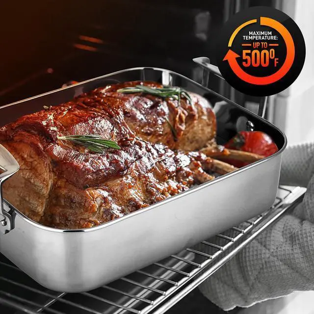 The NutriChef 14" Roasting Pan with Polished Rack & Cast Handle is designed to make your cooking experience more efficient and enjoyable. This high-quality, durable roasting pan is made with 0.8 mm stainless steel construction and features a polished interior and exterior. The removable stainless steel roasting rack ensures even heat distribution, while the wide cast handles provide a confident grip when handling the pan. With the ability to withstand temperatures up to 450°F, its perfect for roasting meats, vegetables, and preparing deep dishes. This PFOA-free pan is safe for use in the oven and is also dishwasher safe for easy cleanup.