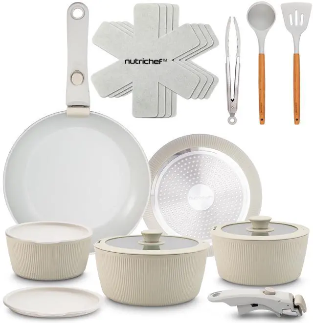 The NutriChef NCCS18DTHGN. 5 18-Piece Ceramic Cookware Set in green is a bright and fresh option for those who love to cook. With detachable handles, this set is designed for easy storage and space-saving, making it ideal for kitchens of all sizes. The nonstick ceramic coating ensures smooth cooking and easy cleanup, while the oven-safe bowls and stackable storage provide additional convenience. The set includes essential cooking utensils and is compatible with all cooktops, making it a versatile addition to your kitchen. The green color adds a lively touch to your cooking space, offering both functionality and style in one complete set.