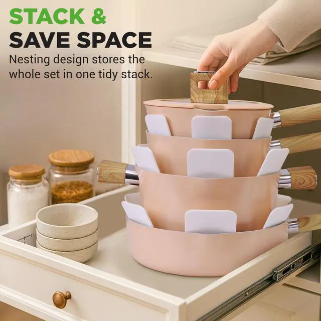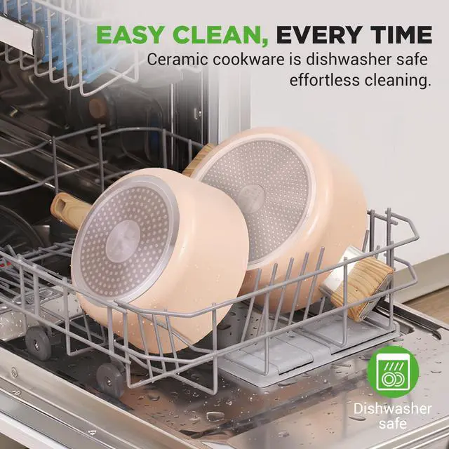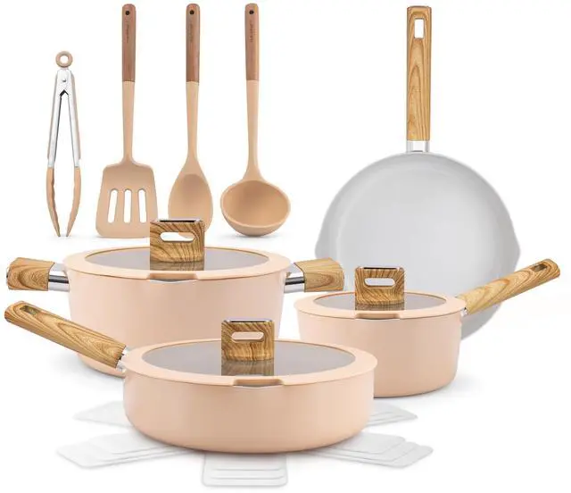 The NutriChef NCCWST14WDPK. 5 Ceramic Cookware Set in pink offers a stylish and practical solution for anyone who loves to cook. This 14-piece set includes nonstick cookware with glass lids, compatible with all cooktops, and designed with heat-resistant handles for safe and easy handling. The set comes with essential cooking utensils, making it a complete package for all your culinary needs. The vibrant pink color adds a fun, modern touch to your kitchen, while the nonstick ceramic coating ensures easy cooking and cleanup. Perfect for those who want both style and function, this cookware set is ideal for everyday cooking and entertaining, providing long-lasting durability and performance in one beautiful set.