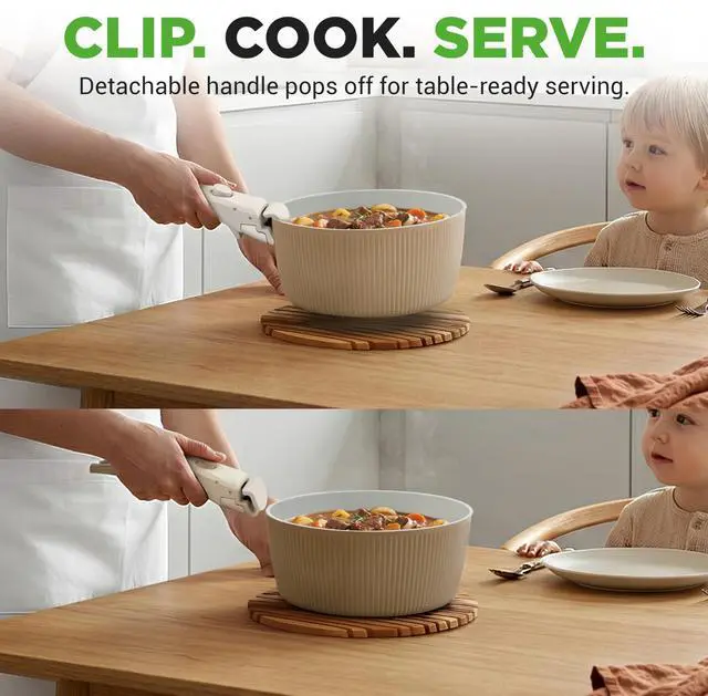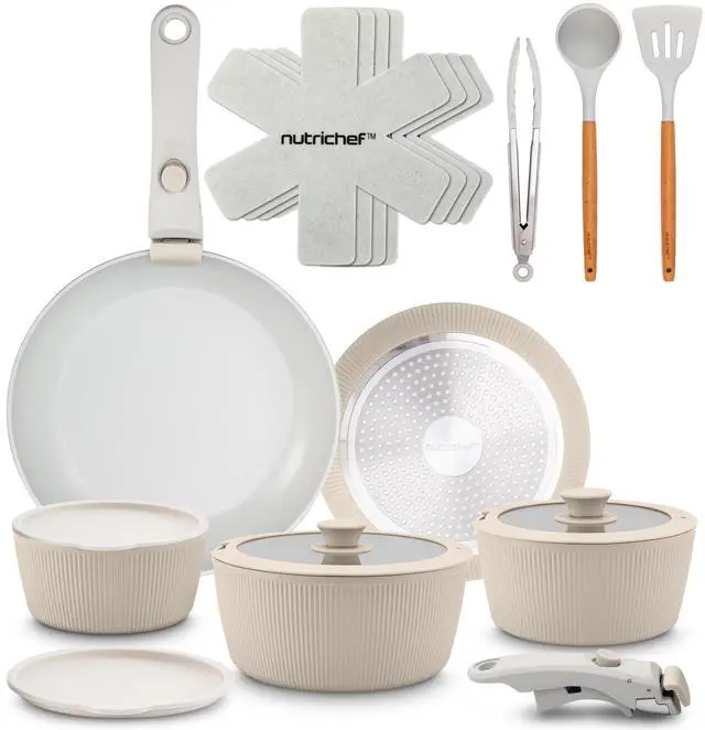 The NutriChef NCCS18DTHCR. 5 18-Piece Ceramic Cookware Set in cream is designed for those who appreciate both style and functionality in the kitchen. This set features detachable handles, allowing for easy storage and space-saving. The nonstick ceramic coating ensures a smooth cooking experience with effortless food release, while the oven-safe bowls and stackable storage options add convenience. Compatible with all cooktops, this set includes cooking utensils and accessories, making it a comprehensive solution for any home cook. The elegant cream color adds a touch of sophistication to your kitchen, making this cookware set not only practical but also a beautiful addition to your cooking space.