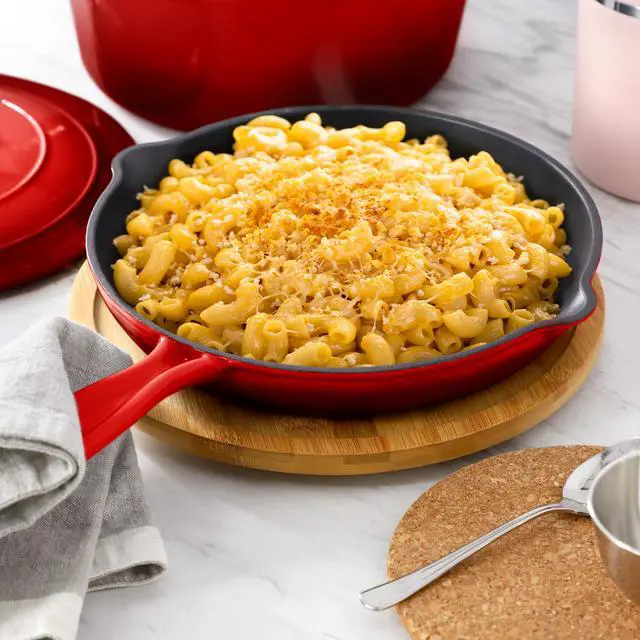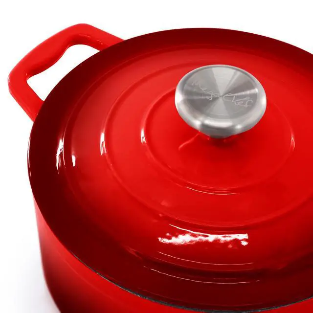 Elevate your kitchen with the MegaChef 7 Piece Enameled Cast Iron Cookware Set in a striking Gradient Red finish. This cookware set is crafted from high-quality cast iron, known for its excellent heat retention and even heat distribution, making it perfect for everything from slow-cooked stews to quick sears. The vibrant enameled coating not only enhances the appearance but also protects the cookware from rust and damage, ensuring durability and long-lasting performance.